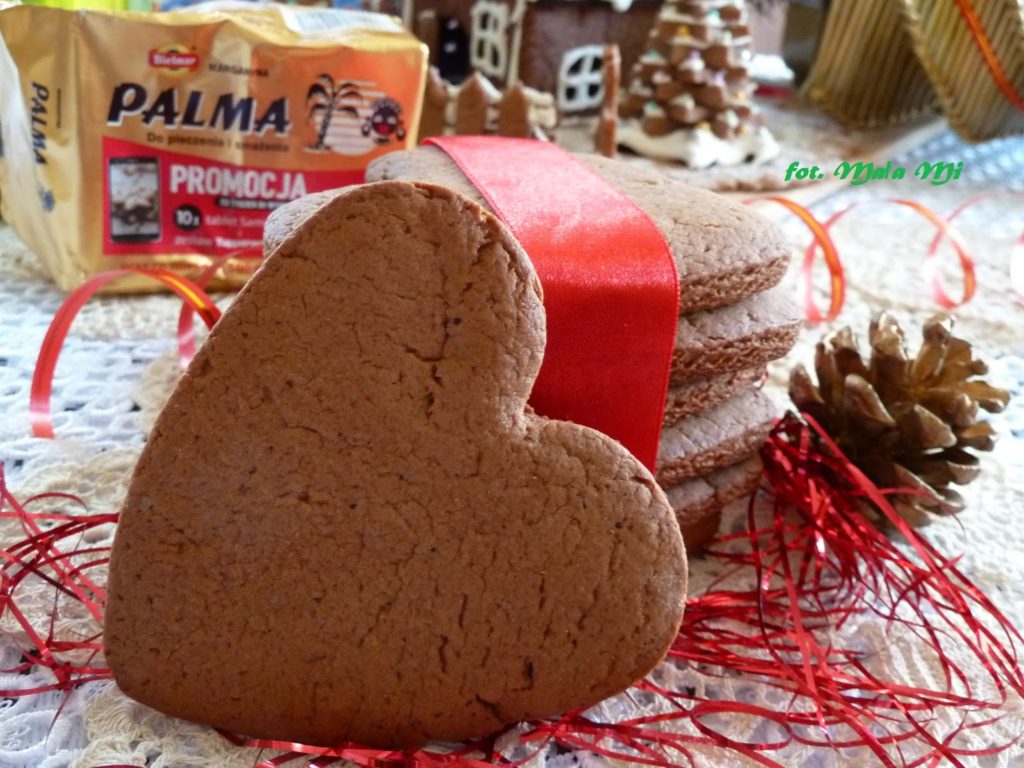 Margarynę Palma (spółki Bielmar), miód, cukier puder i trzcinowy wkładamy do rondelka i podgrzewamy cały czas mieszając, aż składniki się rozpuszczą i połączą. Studzimy. Mąkę przesiewamy do miski, dodajemy przyprawę do piernika, kakao – mieszamy. Sodę rozpuszczamy w 1 łyżce wody, dodajemy do sypkich składników wraz z jajkiem i mlekiem. Na końcu dodajemy ostudzoną masę miodową i zagniatamy gładkie ciasto. Owijamy je folią spożywczą i wkładamy do lodówki na 1 godzinę. Po schłodzeniu wałkujemy na około 4-5 mm i wykrawamy dowolne kształty (u mnie serduszka). Piekarnik nagrzewamy do około 180 stopni. Pierniczki układamy na papierze do pieczenia w pewnych odstępach od siebie (lekko podrosną), pieczemy po około 10-13 minut (w zależności od wielkości pierniczków. Rada: grubą słomką możemy wyciąć otwory na wstążkę – aby móc zawiesić je na choince po upieczeniu i udekorowaniu 🙂