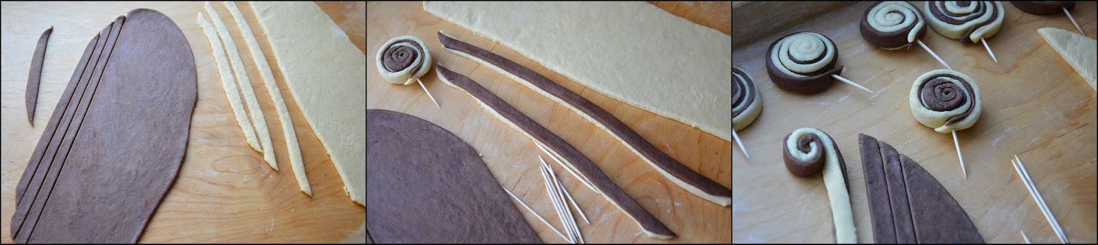 Oba ciasta rozwałkowujemy na placki podobnej wielkości (grubość około 2-3 mm), tniemy na cienkie, w miarę jednakowej szerokości i długości pasy, a potem nakładamy je na siebie. Dwukolorowy pasek z ciasta zwijamy na kształt ślimaczków, następnie nakłuwamy na wykałaczkę. Smażymy na rozgrzanym oleju rzepakowym do zrumienienia z obu stron (jasne ciasto powinno mieć słomkowy kolor, trzeba pilnować, by olej nie był za gorący, bo za szybko będą brązowieć z wierzchu, a nie upieką się w środku). Gotowe wyławiamy na talerz wyłożony ręcznikiem papierowym.