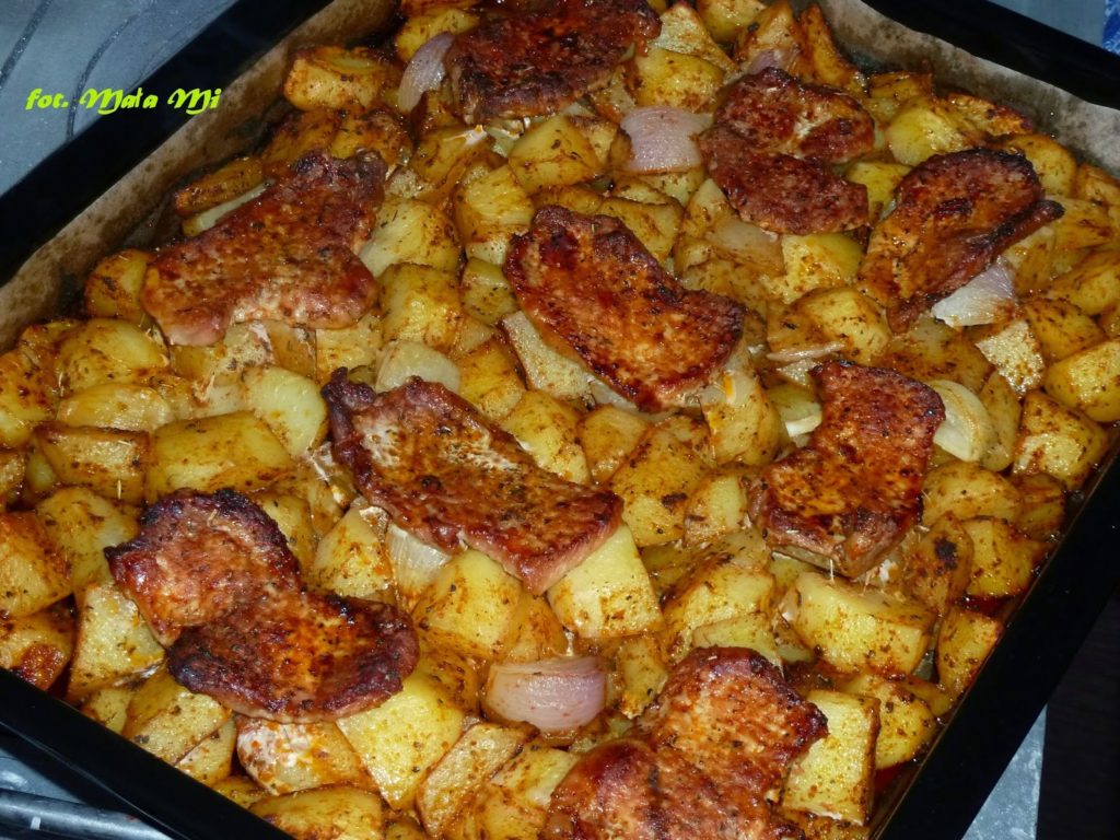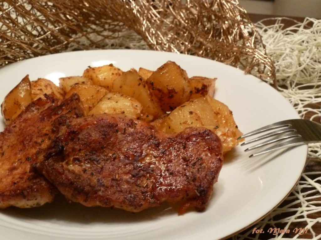 Ziemniaki obieramy, płuczemy i kroimy na ćwiartki lub mniejsze kawałki (jeśli są duże). Dolewamy do nich olej i wsypujemy przyprawy. Całość dokładnie mieszamy, aby każdy kawałek ziemniaka pokryty był marynatą. Odstawiamy na 20 minut. W tym czasie schab kroimy na około 1-1,5cm plastry, lekko rozbijamy tłuczkiem. Brytfannę wykładamy papierem do pieczenia, wykładamy ziemniaki, a pozostałym z przyprawami tłuszczu nacieramy każdy plaster schabu z obu stron. Układamy je na ziemniakach i cebuli. Całość przykrywamy folią aluminiową i zapiekamy przez godzinę w 180 stopniach, po tym czasie zdejmujemy folię i dopiekamy jeszcze 10-15 minut (do ładnego zrumienienia ziemniaków i mięsa).