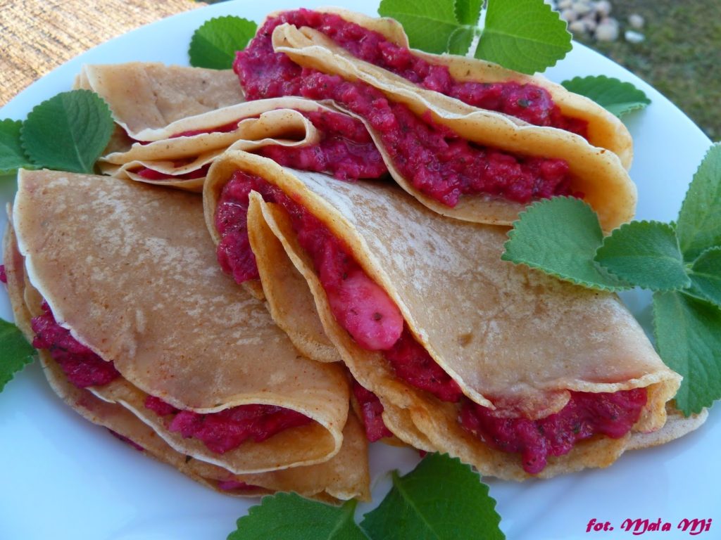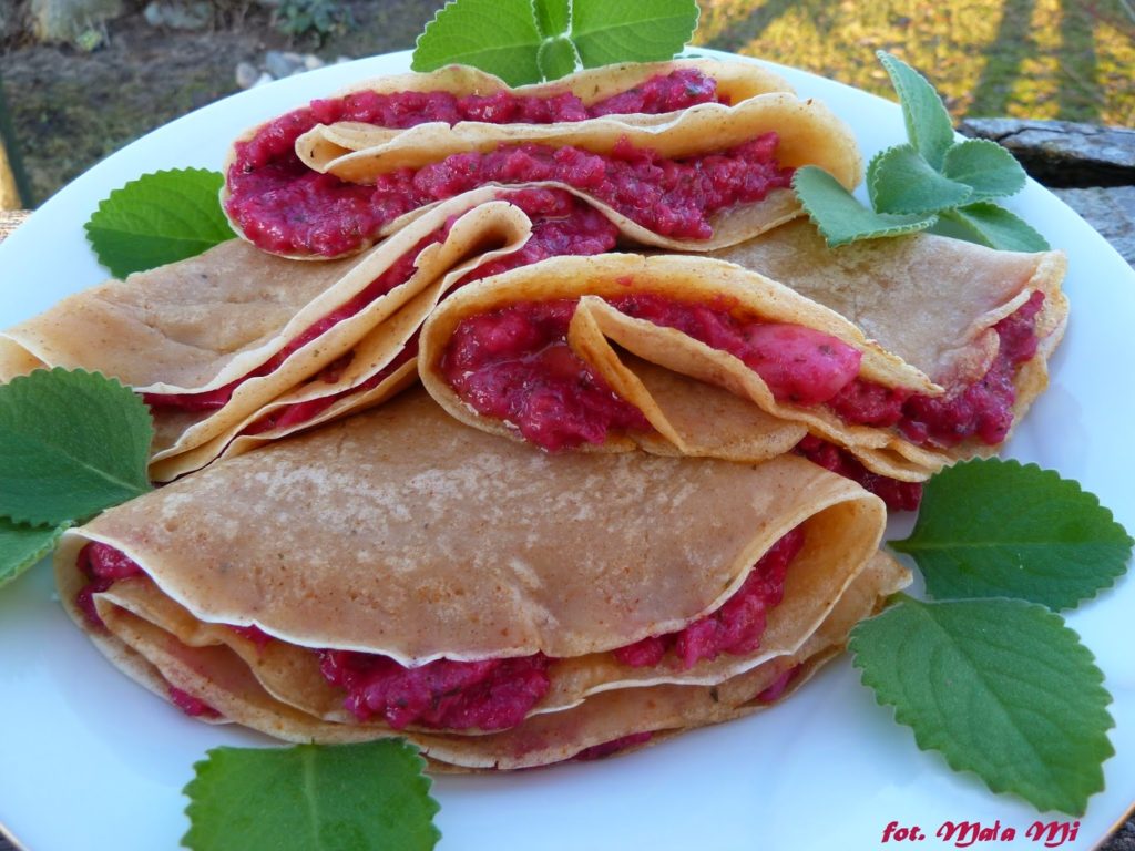 Miało u mnie nie być nic specjalnie walentynkowego… Ale kilka dni wcześniej kupiłam kozi ser. Nigdy go nie próbowałam, ale i pomysłu na niego też nie miałam, więc czekał na swoją kolej 🙂 i oto w walentynkowe popołudnie wpadłam na pomysł wykorzystania go do naleśników w wersji wytrawnej. Był to zupełny przypadek, bowiem przypadkiem właśnie zobaczyłam, że w domu mam melisę w doniczkach!:) nie wiedziałam, bo rośnie sobie spokojnie, do tej pory nie niepokojona u Rodziców 🙂